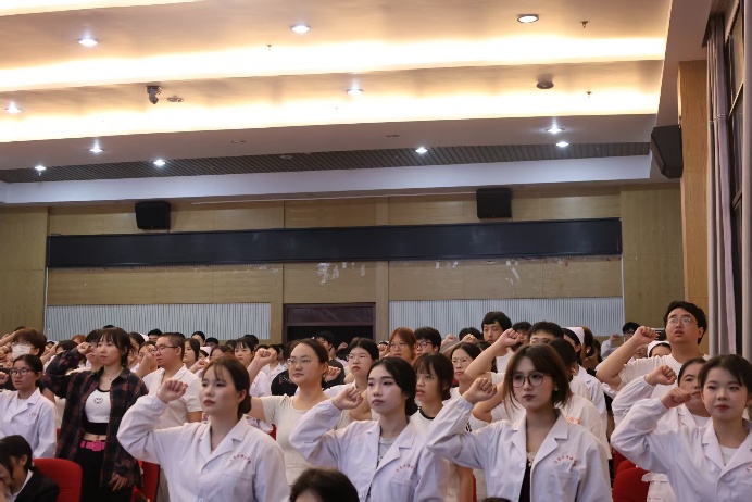 随后,由彭鸿、李春梅和谭莉明三位评委老师为学生代表进行授帽。洁白的燕尾帽是护理精神的传承,激励着我院学子不断成长、进步。授帽仪式后,谭莉明带领全体护理系师生进行宣誓,掷地有声的《南丁格尔誓词》彰显着每一位护理人全心全意投身医疗事业的决心。