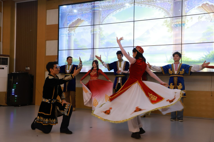 艺术团表演率先登场的是独唱《日不落》,轻快旋律裹挟着青春活力扑面而来,饱含热情,充分诠释了歌曲中的明媚与朝气。紧接着,新疆舞表演惊艳登场,队员们身着绚丽的民族服饰,随着欢快的鼓点翩翩起舞,展现了民族文化的独特魅力。