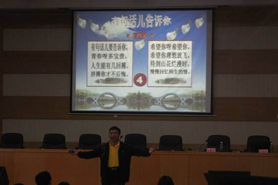 在主持人简短开场后,石教授开始了他的演讲。首先他以一曲美妙的歌曲缓缓拉开了此次演讲的序幕,营造了良好的现场气氛;然后,他用身边的现实经历和事迹向同学们讲述了诚信的历史意义和现代内涵,在赢得同学们热烈掌声的同时也将现场气氛推至高潮;紧接着他播放了“西安大学诚信摊点”、“2013年复旦大学投毒案”等视频,从正反两面解读了诚信的重要性。最后,石教授用一曲诙谐幽默的歌声结束了此次演讲。