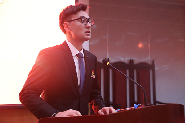 图为麦麦提沙吾提·麦麦提热夏提在2018年全校思想政治工作会议上发言