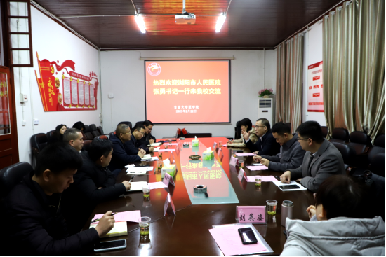 (通讯员 王思源)2月22日,浏阳市人民医院党委书记张勇、副院长李沛、党建办主任杨传豪、科教部主任聂朝霞一行来我院考察交流。吉首大学教务处副处长罗家顺、发展规划与学科建设处副处长田启建、医学院党委书记向志钢、院长向明钧、院党委副书记张旺、副院长李中正等同志在大田湾校区医学院会议室与来宾进行了座谈交流。会议由向志钢主持。