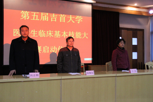 2012年12月15日上午8:00,第五届吉首大学医学生临床基本技能大赛启动仪式在石家冲校区多功能报告厅举行,医学院副院长张珈东、向志刚,副书记王元及本次大赛所有评委老师及参赛选手出席本次启动仪式,仪式由张珈东副院长主持。