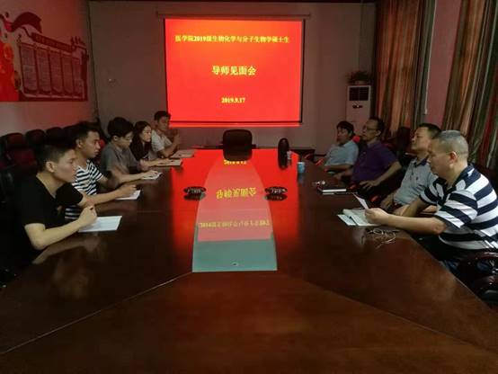 本网讯(医学院朱耀峰)9月17日下午, 2019级分子生物与生物化学研究生与导师见面会于学院208会议室举行。院长彭小宁、书记王群立、副院长向明钧、研究生导师和2019级分子生物与生物化学研究生参加见面会。
