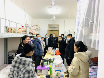 (图为院领导一行下寝看望返校学生)