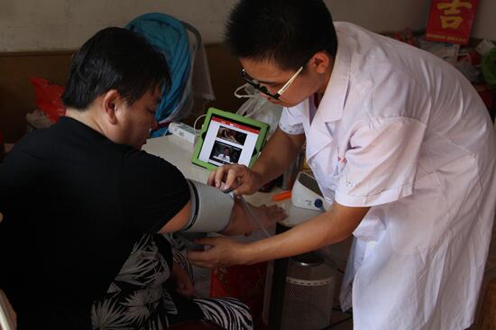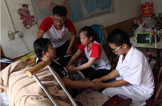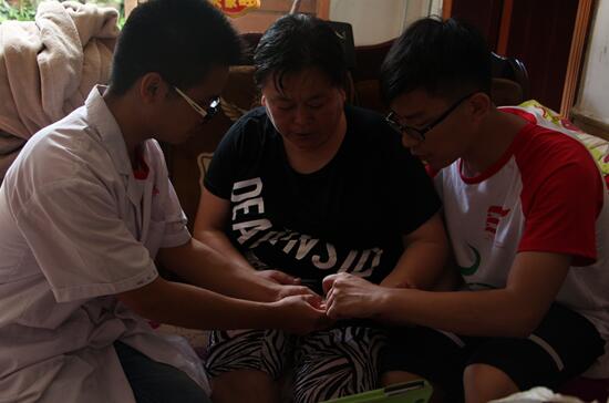 “家里就我一个人,我行动不方便,腿脚不能走远,平时也没人跟我讲话。没事的时候我就看看孙子的照片。”这时我们的志愿者才发现老奶奶的家里到处都是贴的一些小孩子的照片。老奶奶像是一下打开了话匣子,跟我们的志愿者讲述了她病情的由来以及年轻时候的一些事迹。她患有多种疾病,包括高血压、脑溢血和偏瘫,志愿者们为老奶奶测量血压,初次测量为176/109mmHg,带队老师李中正叮嘱老奶奶吃降压药后再进行推拿治疗。幸福的微笑洋溢在奶奶和志愿者的脸上。