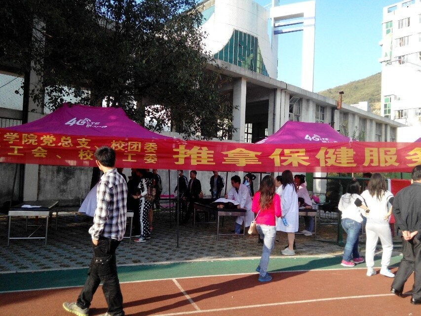 11月6日至7日,医学院党总支践行群众路线建章立制成果,将服务师生最后“一公里”落到实处,在校工会、校团委和关工委的支持下,组织院教工党支部、学生党支部及 “针灸推拿协会”师生党员、积极分子等40余人,在校运会期间为全校师生、运动员开展保健推拿按摩、血压监测、针灸、康复、艾灸、耳穴敷贴、火罐等特色医疗服务。突出了学院特色专业优势,展示了学院群众路线教育的丰硕成果。