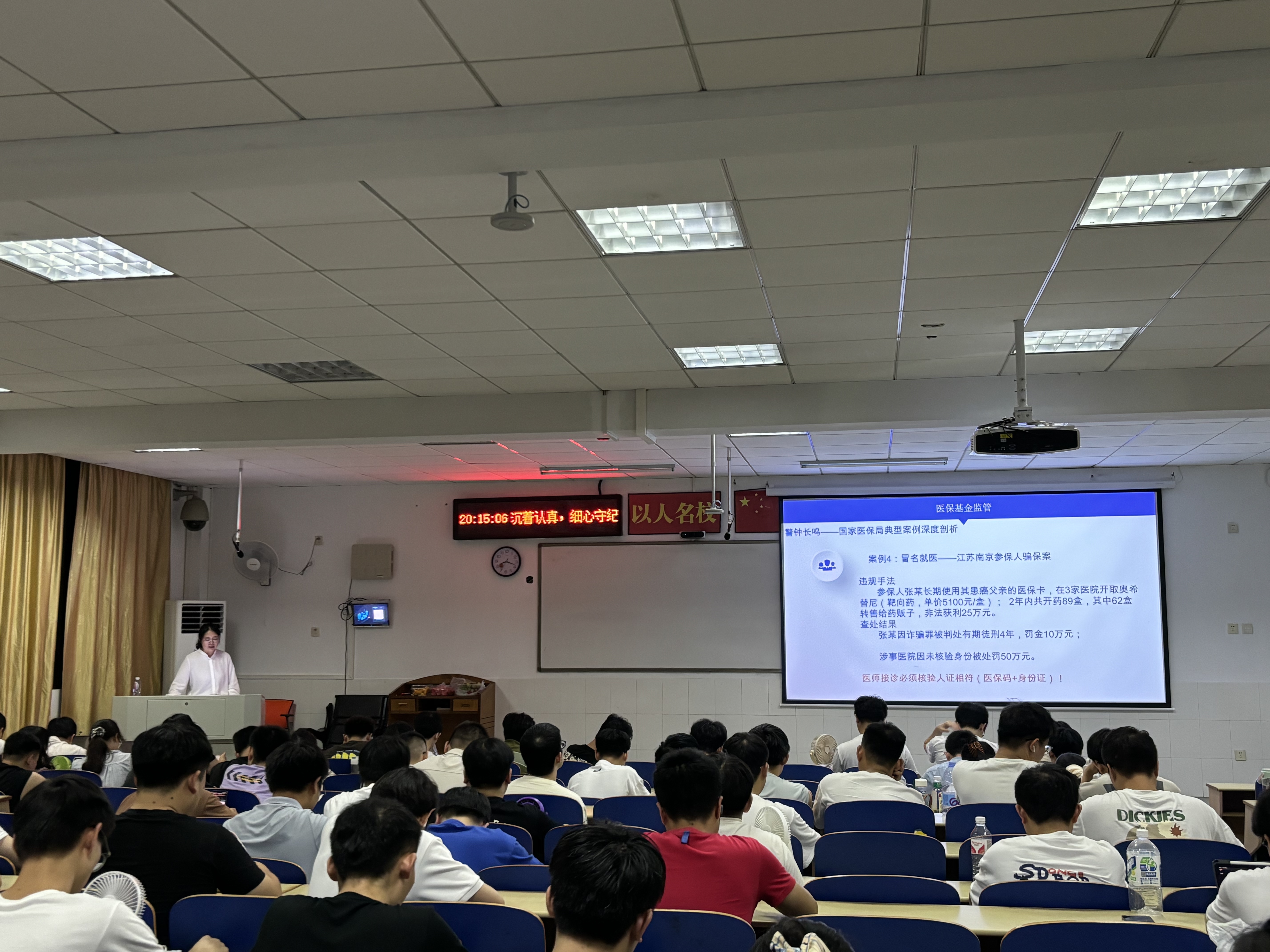 欧治菲副主任系统回顾了我国医保制度的发展历程,重点解读了基本医疗保险、大病保险、医疗救助等多层次保障体系的衔接机制。她强调:“作为未来医生,不仅要精进医术,更要理解医保政策对医疗行为的引导作用。”针对医保基金监管,她通过典型案例剖析欺诈骗保行为的危害,提醒医学生警惕过度检查、分解收费等违规行为,筑牢合规意识。讲座还深入分析了湘西州推行的按病种分值付费(DIP)改革,通过病例对比说明支付方式对诊疗行为的影响。欧治菲寄语学生:“要兼顾医术与政策,既治病救人,又守护基金安全,成长为德才兼备的医学人才。”