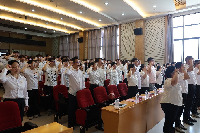 在随后的宣誓环节,李中正带领全体共产党员高举右拳,庄严宣读入党誓词,铿锵有力的誓言饱含着对党的绝对忠诚。