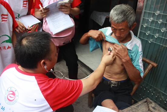 张钰华老师带领我们走入了村民李婆婆家中,说明我们的来意后,张婆婆惊讶的说到:“你们真的是来免费给我们看病的?”随着老师与同学们耐心的为李婆婆测血压,做检查,李婆婆渐渐放下了戒心。当志愿者为她做完推拿治疗以后,李婆婆感动的牵起志愿者的手说:“你们这些大学生要好好读书,以后一定是国家栋梁!”