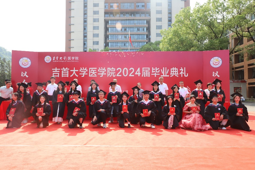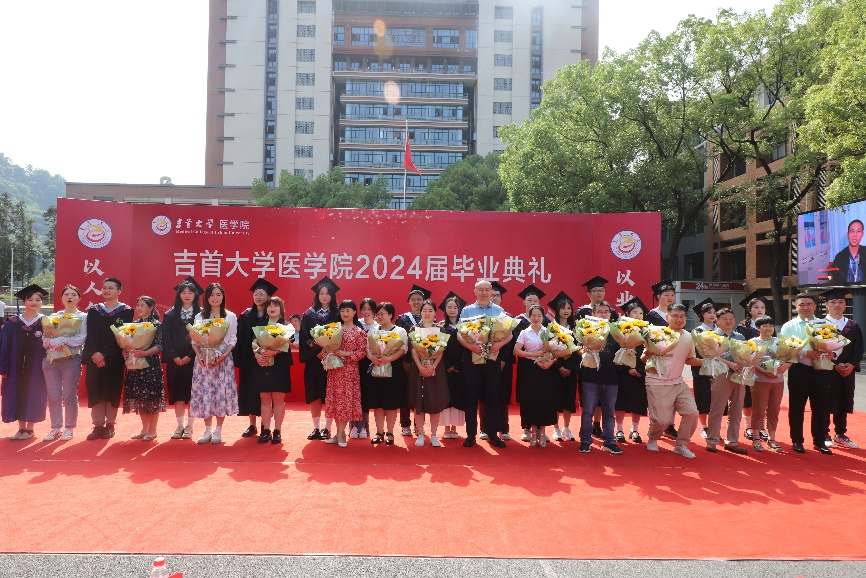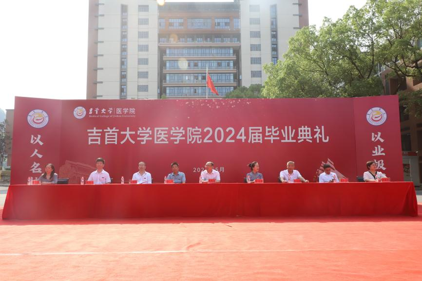 湘西州人民医院、吉首大学第一附属医院院长黄纯海,湘西州民族中医院、吉首大学附属中医医院副院长彭治香,吉首市人民医院、吉首大学第二附属医院院长李政,医学院党委书记向志钢,院长向明钧,副院长黄大元、李中正、李金秀,党委副书记李芳,2024届毕业班班主任、毕业生及学院老师出席典礼。